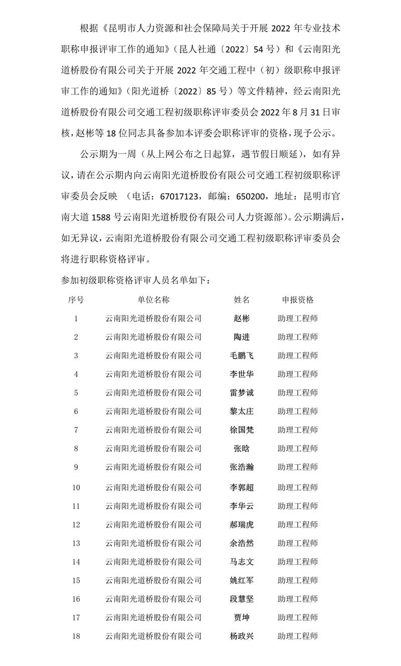 關(guān)于2022年云南陽光道橋股份有限公司交通工程初級職稱評審委員會參加職稱資格評審人員的公示